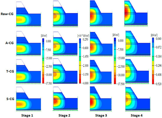 As can be seen from Figure 4 and Table 6, during the first phase of construction, the excess pore water pressure is mainly concentrated in the cohesive soil base, and in the order of the value of the excess water pressure of each sample from large to small is S-CG, A-CG, Raw-CG, and T-CG. With the consolidation of the second stage, the pressure distribution spreads to the subgrade, however, the pressure value decreases gradually. In the third stage, with the addition of the second floor of the subgrade, the excess water pressure increases, and the larger pressure value is distributed in the cohesive soil base near the subgrade, and the S-CG specimen pressure value is still the maximum. In the fourth stage, with long-term solidification, the excess water pressure in the Raw-CG specimen is distributed in the lower subgrade and near the clay, and its value is greater than the other three specimens. The above analysis shows that the samples are easier to solidify and stabilize after treatment, the excess water pressure value in the S-CG specimen is the maximum.