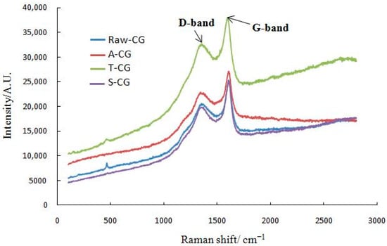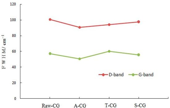 As can be seen from Figure 9, the four specimens have two typical carbon materials Raman peaks with D-band between 1356 cm−1 and 1366 cm−1 and G-band from 1591 cm−1 to 1607 cm−1. IG/ID strength ratio of Raw-CG, A-CG, T-CG, S-CG are1.24, 1.20, 1.16, 1.25, respectively, indicating that the sample after being soaked in distilled water and acid solution, the carbon structure in the coal gangue is not complete and has many defects. According to the FWHM information of Raman peaks shown in Figure 10, the D-band and G-band of the acid-alkali treated coal gangue are smaller than those of the untreated coal gangue, indicating that its crystal structure is relatively regular, the chemical bond is consistent, the material tends to be regulated, and the performance is relatively uniform.