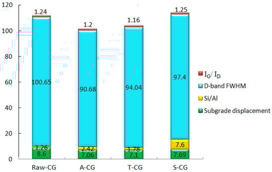 The displacement of treated coal gangue subgrade is less than that of the untreated coal gangue subgrade. The displacement of A-CG and T-CG is close to each other and smaller than those of S-CG. The slope foot displacement and stability coefficient meet the specification requirements. In terms of excess pore water, after long-term consolidation, the subgrade paved by treated coal gangue samples is more easily consolidated. According to SEM and EDS, A-CG and T-CG particles become smaller and their surface area and internal friction angle increase, which increases their shear strength and compression performance, so they are easy to consolidate. However, the S-CG sample is due to the production of a large amount of Na-Si-Al gel, which increases the cohesion of the sample, improves the density, shear strength and compressive performance, and the consolidation effect is good. Through the Raman test, it can be known that the unstable carbon structure of A-CG and T-CG has been destroyed, resulting in relatively well-structured grains with the crystal structure, which improves the stability of its subgrade. However, S-CG is attached to the surface of coal gangue particles by colloidal coating, which makes the whole material neat and uniform, and ensures the stability of the subgrade. In order to learn the relationship between macro displacement change and micro-influence factors, the final subgrade displacement and Si/Al, IG/ID, D-band FWHM are selected for analysis, and the contrasting diagram is shown in Figure 11.