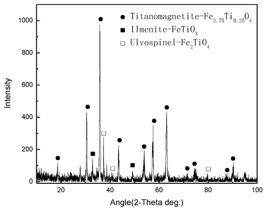 As shown in Table 1, the iron grade of vanadium–titanium–magnetite is relatively low and the MgO content is only 0.29%. The impurity content is high. The contents of SiO2, Al2O3, and CaO are 6.28%, 1.74%, and 3.72% respectively. The TiO2 content reaches 12.96%, which is difficult to utilize by traditional ironmaking technology. Figure 1 depicts the diffraction peaks of vanadium–titanium–magnetite concentrates, where the ores with superior crystallization are predominantly composed of iron, ilmenite (FeTiO3), ulvospinel (Fe2TiO4) and titanomagnetite (Fe2.75Ti0.25O4).