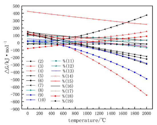 The carbothermic reduction process of vanadium–titanium–magnetite could be divided into two parts [22,23]. One part is that the iron oxides are directly reduced by C, the other is the indirect reduction which used CO as the reductant, containing carbon dissolution reaction as well as the reduction of iron compounds. The possible reactions are listed in Table 2. Figure 3 shows the relationship between the △G and the temperature.