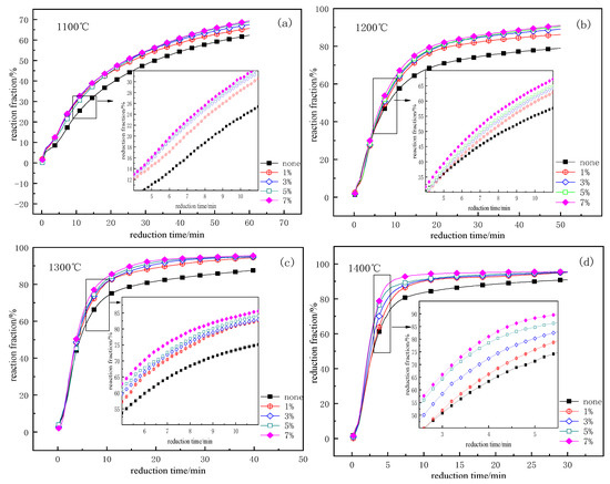 Figure 4 shows that the addition of CaF2 can accelerate the reduction process. When the reduction temperature was 1100 °C, the reaction fraction rose by prolonging the reduction time, although the reaction could not reach equilibrium within the scope of the experiment time. The reaction process increased as the additive content increased and the temperature reduced with 1% CaF2. The reaction process reduced when more than 3% CaF2 was added. The higher the reduction temperature, the less time required for reduction equilibrium. When CaF2 of 3% was added, the equilibrium time for the carbothermic reduction at 1200 °C, 1300 °C, and 1400 °C was 22 min, 10 min, and 6 min, respectively. The reaction fraction was close to 90% when 3% of the CaF2 was added at 1200 °C. When the temperature was over 1300 °C, the change of reduction fraction was relatively small, reaching about 95% at 1400 °C. When CaF2 of 7% was added, the reaction fraction increased, but the increasing trend was not obvious. The optimum conditions were obtained at the reduction temperature of 1300 °C and additive amounts of 3%.
