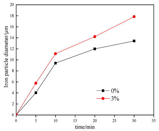 The grain sizes of the metal iron varied with the reduction time and they were analyzed with “Image-Pro-Plus”, all the complete grains in the picture are selected out, and the average grain size is calculated. The results were shown in Figure 6. The CaF2 had a significant effect on the formation, aggregation, and growth of the metal iron grains, and the effect was more evident with longer reduction time.