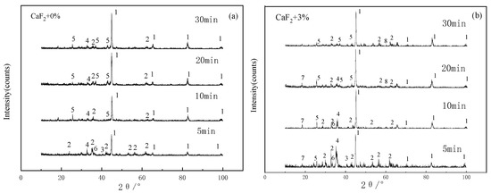 Figure 7 shows the XRD results of the reduction products that were reacted with none or 3% CaF2 for 5 min, 10 min, 20 min, and 30 min.