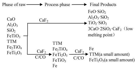 The CaF2 accelerated the diffusion and migration of the metal iron points, extended the grain size, eroded the surface of the vanadium–titanium–magnetite particles, destroyed the crystal structure of the non-metallic reduction products in the specimens, promoted the aggregation of the particles like titanomagnetite, ilmenite, and ferrous brookite, increased the lattice distortion of the reduced phase, and improved the reduction capacity.