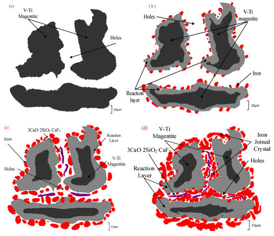 According to the analysis results depicted in Figure 5, Figure 7 and Table 3, the schematic diagram of the samples reduction process with adding CaF2 is given in Figure 9. The CaF2 had little effect on the reduction process at the initial stage. As the reaction layer thickened, the reduction degree of vanadium–titanium–magnetite rose, the iron grains proliferated, and the slag phase formed. The CaF2 reacted with the high-melting-point phase to generate a certain amount of 3CaO·2SiO2·CaF2, which had a low-melting-point and could be a “lubricant” to the reaction layer and the interstitial flow, promoting the migration of the iron and the aggregation of slag.
