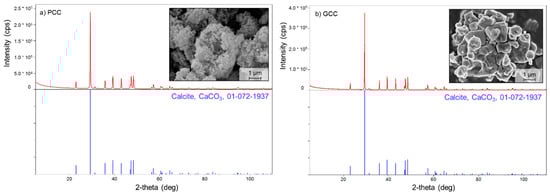 XRD patterns and SEM pictures of calcite materials: (a) precipitated calcite (PCC) and (b) ground calcite (GCC).
