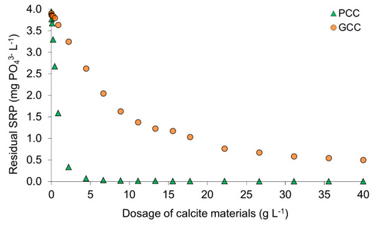 Our study revealed large difference in the sorption capacity of both calcites for SRP with a clear dominance for PCC that shows a 7 times higher sorption compared to GCC (Figure 2 and Figure 3). One explanation could be the slightly higher initial pH in the experiment with PCC compared to GCC (7.9 and 7.7, respectively; Table 1), as higher pH promotes adsorption of phosphate onto calcite [41] and Ca-PO4 formation [79]. However, this effect probably plays a minor role due to very small difference in the initial pH. The main reason that explains the higher performance of PCC in sorption efficacy is the difference in SSABET (12.36 m2 g−1 versus 1.72 m2 g−1 for GCC). Berg et al. [39] have reported that SSA strongly influences the P binding capacity of calcite in oversaturated conditions due to adsorption and/or co-precipitation processes.
