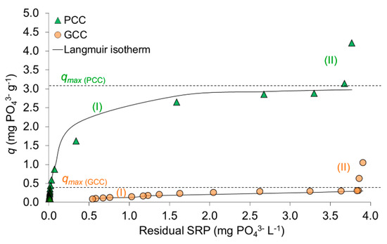 Sorption isotherms of precipitated (PCC) and ground (GCC) calcite at initial SRP concentration of 4.1 mg PO43− L−1 after equilibration time of 24h (qmax—maximum adsorption calculated using the Langmuir model). Numbers (I) and (II) indicate different sections of the isotherms.