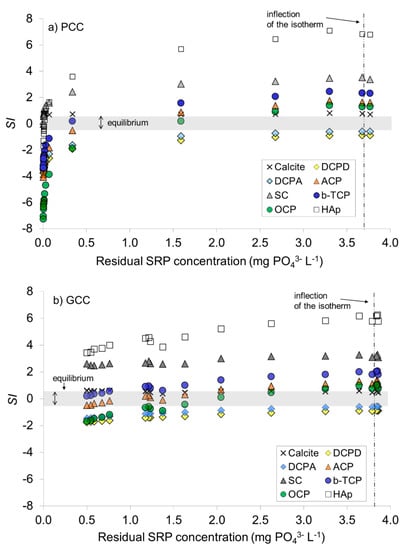 Saturation index (SI) for calcite and Ca-PO4 compounds in the pore water after equilibration for 24 h with (a) PCC—precipitated calcite, (b) GCC—ground calcite at an initial SRP concentration of 4.1 mg PO43− L−1. Dashed line indicates residual SRP concentration at the inflection of the isotherm in the Figure 3. For abbreviations of Ca-PO4 compounds see Table 4.