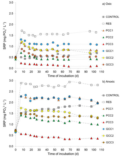 Concentration of SRP in the overlying water of (a) oxic and (b) anoxic microcosms subjected to resuspension only (RES), resuspension and SRP inactivation using calcite materials (PCC1–PCC3 and GCC1–GCC3) and control (CONTROL)—microcosms not subjected to resuspension and SRP fixation. Dashed lines were used for better visibility of the trend. Zero on Y axis refers to pre-treatment conditions; resuspension and SRP inactivation were conducted on the 1st day of the experiment. For treatment abbreviations see Table 3.