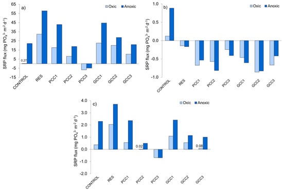 During the post-resuspension phase of incubation (>7 days of incubation), further changes in the overlying water were observed. In microcosms subjected to resuspension only, SRP did not show a constant tendency (Figure 5a,b), but negative fluxes calculated for this incubation phase (−0.14 and −0.16 mg PO43− m−2 d−1 in oxic and anoxic incubation, respectively; Figure 6b) demonstrate a re-transfer of small amounts of SRP into the sediment. In the microcosms treated with calcite, irrespectively of incubation conditions, SRP concentration showed a decreasing trend with time (Figure 5a,b). In the microcosms treated with low doses of calcites (PCC1 and GCC1) some short term increase in SRP took place. This corresponds to similar changes observed in the resuspended microcosms without calcite. On the other hand, in the microcosms treated with medium and high doses of calcite (PCC2–PCC3, GCC2–GCC3), SRP concentration almost continuously decreased (Figure 5a,b), which shows a high stability of SRP sorption in the sediments and its further binding for about 3 months after treatment. Negative SRP fluxes calculated for the post-resuspension period (Figure 6b), which were about 2–6 times higher than in resuspended sediments without calcite, show that all calcite dosages resulted in enhanced SRP transfer from the overlying water into the sediment during the 98 days of incubation. In sediments enriched with PCC, the SRP flux into the sediment decreased with increasing calcite dosage in oxic conditions. In anoxic PCC treatments as well as in oxic and anoxic GCC treatments, the SRP flux increased with increasing dosages only for the low and medium additions of calcite materials (PCC1-PCC2 and GCC1-GCC2), whereas high additions (PCC3, GCC3) resulted in the lowest SRP flux (Figure 6b). At the same time, no clear effect of incubation conditions can be observed: for example in GCC3 treatments the oxic flux was 1.6 times higher than the anoxic one, whereas in PCC3—the difference was the same (1.6 times) but opposite (Figure 6b).