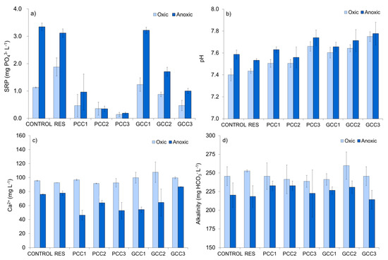 Alkalinity in the pore water was affected by incubation conditions and was lower under anoxia than in oxic conditions (Figure 7d). The noted difference ranged from 9 to 33 mg L−1 and accounted for 5–13%. Alkalinity did not change due to sole resuspension (recorded increase in anoxia was 3% and can be neglected). Changes due to addition of calcites were inconsiderable. In anoxia, except for GCC3, mean alkalinity increased by 5–15 mg L−1 (2–7%), as compared to resuspended sediments, whereas in oxic conditions it decreased, except for GCC2, by 7–14 mg L−1 (3–6%) (Figure 7d). Alkalinity did not show an obvious trend with regard to amount of calcite added, except for PCC amendments in oxic conditions, where it declined with decreasing PCC dosage (Figure 7d).