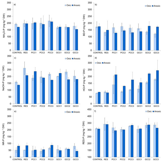 NR-P, considered as non-mobile organic fraction (Figure 8e), had a similar share of the total P as HCl-P (5 and 9% in oxic and anoxic incubation, respectively, mean values) in control sediments. This pool was not affected by resuspension alone (Figure 8e). In oxic sediments with calcite addition, the mean NR-P content remained similar or slightly increased as compared to control and resuspended sediment without calcite. In contrast, under anoxia mean NR-P concentration decreased (except for PCC3) by 26–41 mg g−1 DW (30–48%) as compared to resuspended sediments without calcite (Figure 8e).