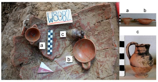 - W8082—grave inventory composed of three objects: a miniaturistic trefoil jug with reserved inferior part of the body, a miniaturistic skyphos with dots below the lip and a two-handled bowl with black-glaze handles, all dating around the mid-5th century BC (Figure 1a–c).