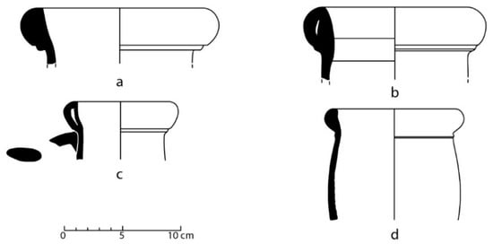 Typology of western Greek amphorae produced at Poseidonia (after Gassner []): (a) Sourisseau form 2; (b) Gassner rim 3; (c) Gassner rim 4; (d) Gassner rim 7. Panels a and b from Gassner and Scopetta [] (Figures 1 and 2, catalogue 2.11); c and d from Gassner [] (Figure 10b,c).