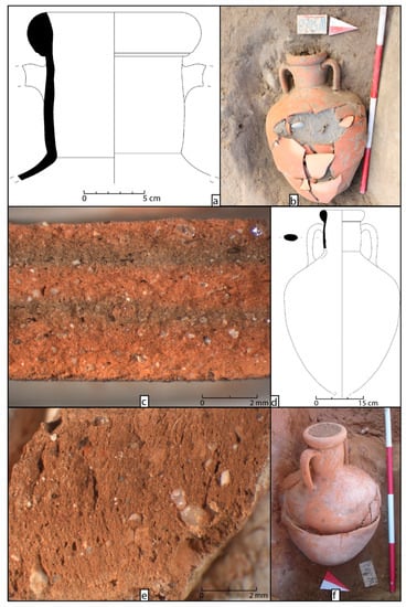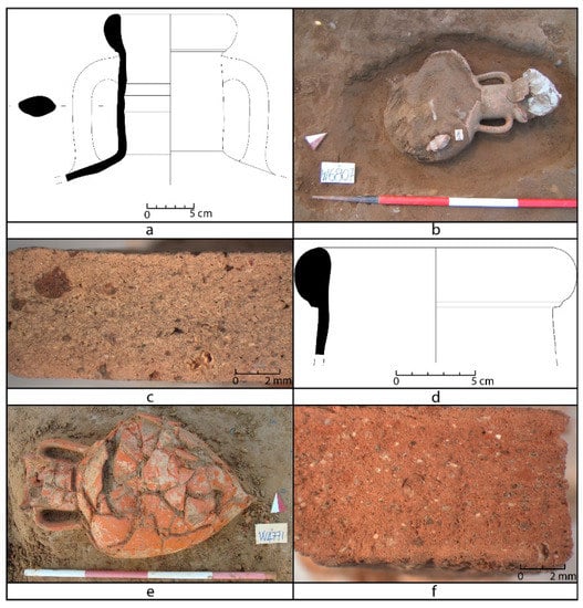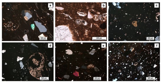 Common ware samples (M231/2, M231/3) basically show the same petrographic features of production indicators, except for a slightly more active matrix (Figure 8e,f). They mostly contain coarse inclusions of siliciclastic origin composed of quartzose grains with minor amounts of alkali feldspar and plagioclase. Clinopyroxene was detected in low amounts in M231/2 (Figure 8e). Decomposed carbonate bioclasts (Figure 8e) and lumps (Figure 8e,f) are frequent.
