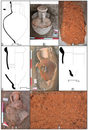 Amphorae found in Elea (M6/26, M10/4, M10/5, M10/22) are characterised by very similar petrographic features. The matrix is inactive in samples M6/26, M10/4, M10/5 and active in M10/22. Porosity is low. The inclusions are moderately sorted and bimodally distributed and are represented by quartz and muscovite in the fine fraction. Coarse grains are mainly siliciclastic and are composed of quartz, sandstone, and feldspars (alkali feldspar and plagioclase). Carbonate fragments are also common and are often represented by decomposed grains (Figure 9e–g,i) and bioclasts (M10/4, M10/22; Figure 9g). Occasional clinopyroxene was detected in M6/26, M10/4, and M10/22 (Figure 9f,h,i).