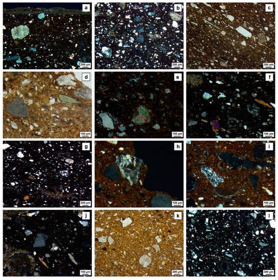 The common features of all amphorae are the presence of fine particles of quartz and muscovite and abundant siliciclastic coarse grains represented by quartzose inclusions (quartz, sandstone, and occasional chert) (Figure 6a–l) with a modal percentage, estimated on representative samples, approximately ranging from 15% to 22% (Table 3). Minor alkali feldspar (approx. 0.7–3.5%) and plagioclase (less than 0.3%) also occur. Altered (partly sericitised) feldspar minerals occur in several samples (Figure 6c) and more frequently in M179/133, M179/135, and M179/147; deformed feldspar crystals were occasionally observed (Figure 6j). In most samples sporadic clinopyroxene crystals are visible (Table 3; Figure 6d,f,g), whereas low amounts of volcanic lithics were observed in sample M179/135. Metamorphic lithics (schist, gneiss) also occur (0.3–1.4%) in several samples (Figure 6h,i) and show slightly higher amounts in samples M179/133 and M179/135 (Table 3).