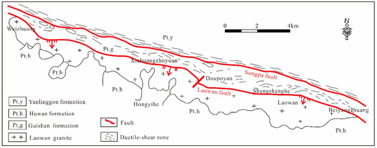 The Laowan gold deposit is located in the East of the Qinling-Dabie orogenic belt and the Laowan ductile shear zone. The Northern and Southern sides are bounded by the Laowan and the Songpa ductile shear belt. The main host rock of the Laowan deposit is a metamorphic rock series from the Guishan Formation of the middle Mesoproterozoic period, which has undergone many ductile and brittle shear activities (Figure 2). The lithology is mainly mica-quartz schist and plagioclase-hornblende schist, and mylonitic silicified rocks [53,54,58,67]. The original rocks are basic volcano-clastic sedimentary [53].