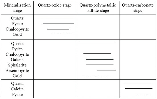Paragenetic sequence of ore minerals and the main ore stages of Laowan gold deposit (adapted from [55]). Solid lines indicate a high amount of the mineral and the dotted lines indicate a small amount of the mineral.