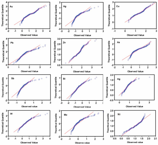 The Q–Q plot is a powerful tool for visualizing element distributions [83]. The Q–Q plots (Figure 6) indicated that the geochemical data processed by log-transformation did not obey normal distribution. The data parallel to the line represents the dominant background value in the geochemical data. In contrast, the data at both ends represent a relatively small number of anomalies, which are of great significance.