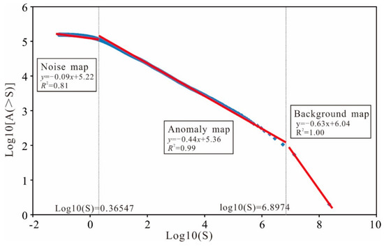 Based on the fractal theory, Cheng et al. [23] proposed the C–A fractal model, concerning the relationship between the concentration value () and the area (A) enclosed by the contour value ρ: