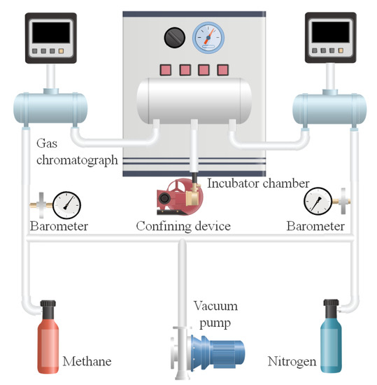 A natural gas diffusion coefficient experiment was conducted using the TK-I apparatus in the state key laboratory of oil and gas reservoir geology and exploitation, Southwest Petroleum University (Chengdu, China). Figure 2 shows a schematic diagram of the gas diffusion coefficient measurement apparatus. The main body of this apparatus consists of the confining pressure and temperature control system and gas chromatograph. The maximum experimental pressure can be as high as 69 MPa with 0.01% accuracy and the heating bath system temperature can reach 177 °C with an accuracy of ±0.1 °C to ensure the appropriate confining pressure and isothermal conditions. The gas diffusion coefficient experiment was performed with the above apparatus as follows: