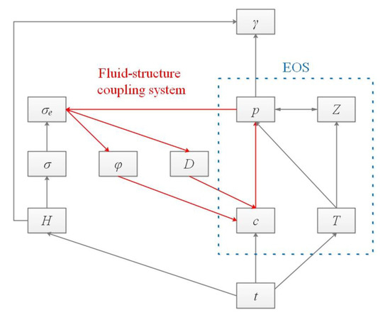 The pressure coefficient is a function of the buried depth and reservoir pressure. The reservoir pressure is directly determined by the gas state equation, which contains three variables, namely, Z, c and T. Z is determined by the reservoir pressure and temperature and therefore has a coupling relationship with the reservoir pressure. The gas concentration is obtained by the shale gas diffusion equation. The dynamic evolution of the reservoir pressure has a direct influence on the porosity and diffusion coefficient of the reservoir by changing the effective stress. Therefore, the internal variable p of the shale gas diffusion equation has a fluid–solid coupling relationship with D and φ, which appears as a closed loop path in the parameter transfer diagram, as shown Figure 3. The tectonic evolution experienced by the reservoir directly controls the basic parameters such as the depth and temperature.