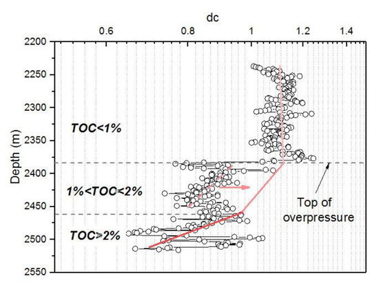 Drilling engineering data show that dc is mainly controlled by reservoir pressure changes [26,27]. Under certain conditions, the dc index becomes larger as the depth of the well increases. When drilling a formation with an abnormal pressure, the measured dc deviates from the normal trend line. The equation for calculating the reservoir pressure gradient [27] is: