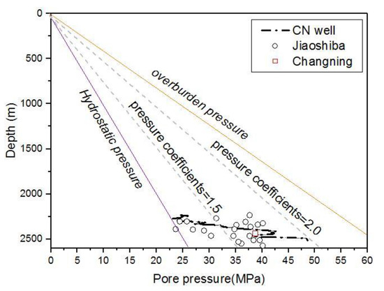 Figure 5. Depth profiles of the reservoir pressure coefficient results calculated by sonic logging of the O3w–S1l shales, as well as the measured pressure coefficient data for the Jiaoshiba and Changning shale gas fields near the study area [6].