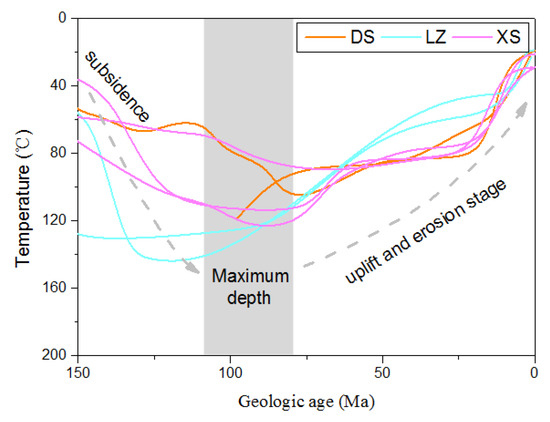 Figure 7. The thermal history of the Lower Triassic Xujiahe Formation in the study area based on apatite fission track data [35,36,37]. DS stands for the Dingshan area, approximately 150 km northeast of the study area. LZ stands for Zhangzhou, which is located 100 km north of the study area. XS stands for the Xishui area, approximately 120 km east of the study area.