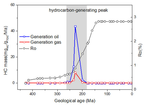 The basin simulation results indicate that the O3w–S1l shales in the study area have complex burial, thermal (Figure 6) and hydrocarbon generation evolution histories (Figure 7). Specifically, the evolution history can be divided into four stages corresponding to the regional geological background.