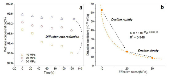Figure 10. Shale diffusion test results. (a) Methane gas concentration curve under different confining pressures. (b) Variation in the shale diffusion coefficient with the confining pressure.