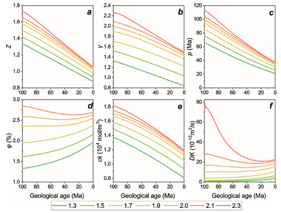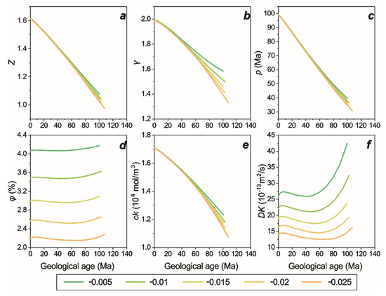 Figure 12. Evolution of compression coefficient (a), pressure coefficient (b), reservoir pressure (c), porosity (d), free gas concentration (e) and diffusion coefficient (f) for the different initial pressure coefficients (γ0) of the CN well after uplift.