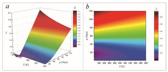 Figure 13. Three-dimensional distribution (a) and plane contour (b) of the methane compression factor (Z) in the ranges of the reservoir temperature and pressure (Equation (6)). Generally, the compression factor increases with the reservoir temperature and pressure.