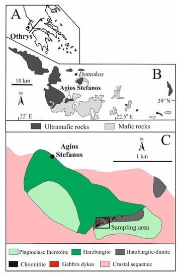 Location of the Othrys complex in Greece (A); general geological map of the Othrys ophiolite showing the location of the Agios Stefanos chromium mine (B) and (C) detailed geological setting of the Agios Stefanos area (modified after [10] and [5]).