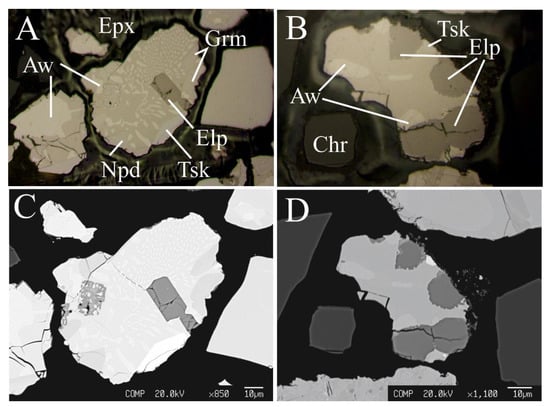 Digital image in reflected plane polarized light (A,B) and back-scattered electron image (C,D) showing eliopoulosite from the chromitite of Agios Stefanos. Abbreviations: Elp = eliopoulosite, Grm = grammatikopoulosite, Tsk = tsikourasite, Aw = awaruite, Npd = nickelphosphide, Chr = chromite, Epx = epoxy.