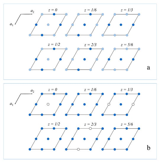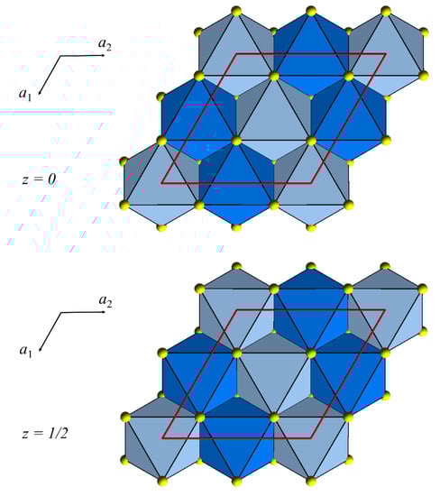 Since the octahedral vacancies’ distribution within the layers at z = 0, z = 1/6, and z = 1/3 is perfectly replicated at layers at z = 1/2, z = 2/3, and z = 5/6 (Figure 4), no contribution to hkl reflections with l = 2n + 1 is given by metal atoms. However, their intensities (<I/σ(I)> = 564.3 vs. 3349.2) are even higher than those leading to doubling of a-axis, due to the different position of sulfur atoms related to the different octahedral orientation in the layer at z = 0 with respect to z = 1/2 (Figure 5).