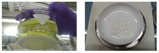 The formation of gel was confirmed at room temperature and at 70 °C, where the reactor was opened and an evaporation of the used hydrochloric acid was observed, as shown in Figure 4b. The maximal leaching efficiency was obtained at 90 °C in a duration of 2 h (Experiment 5).