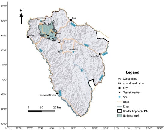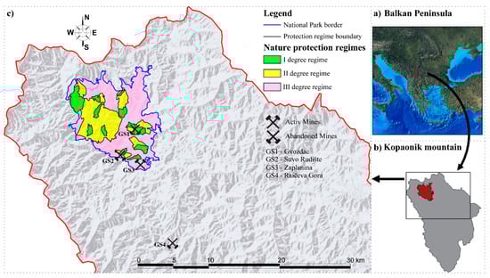 Kopaonik Mountain, with an area of approximately 2750 km2, lies at the contact of central and southern Serbia and represents the boundary between the Dinaric and Rhodope Mountain Systems. It is surrounded by river valleys: Jošanica, Pločanska and Koznička in the north; the middle course of Rasina and Blatašnica in the northeast; Toplica, Kosanica, Dubnica and Lab in the east; Lab in the south and Sitnica and Ibar in the west []. The mountain stretches in the north, west, south and east directions to a length of 80 km, reaching, in its middle part, a width of about 40 km [,]. In 1981, an area of 11,810 ha was proclaimed Kopaonik National Park. The Kopaonik National Park is located in the municipalities of Raška and Brus, and the protection zone also in the area of Leposavić Municipality []. This research included the active Belo Brdo–Zaplanina mine in the Zaplanina area and abandoned mines Gvozdac, Suvo Rudište and Raičeva Gora (Figure 1).