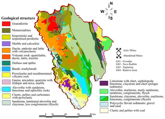 Belo Brdo–Zaplanina (GS3) is a complex of underground mines of lead and zinc ore. It is located in the III degree of protection regime, 5 km southeast of Pančić Peak. The wider surroundings of the Belo Brdo deposits are built by geological formations of different ages, genesis and composition. Among them are the oldest rocks, the so-called Paleozoic metamorphites, which form the central part of Kopaonik, and are located in the immediate halo of the Kopaonik intrusive. In their geological structure, fracture structures as forms of deformation elements are highly expressed and present. In relation to general rendering, they are classified into longitudinal (NW–SE), transverse (NE–SW) and diagonal (E–W). The most significant, for the structure of the reservoir environment, is certainly the regional fault structure of the northwestern orientation on the stretch from “Vojetina” to “Šatorica”, which indicates the tectonic contact of serpentinite towards the rocks of the Triassic, Jurassic and Cretaceous ages (Figure 3) []. Ore exploitation began in 1933. For the purposes of mining activities in 1936, a tunnel 2.5 km long was dug, which served as the main road for the export of ore from all horizons in the Belo Brdo and Zaplanina mine complex, which, at that time, represented the technological and production unit. Remains of old mining pits are visible in the mining area of Mount Vojetina.