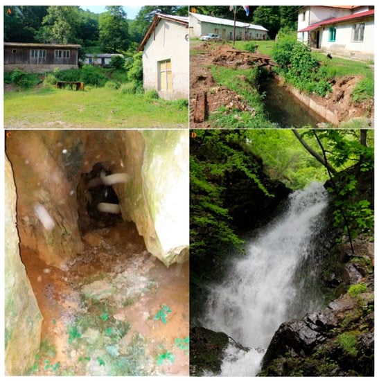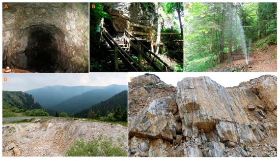(A,B) Mining facilities in Zaplanina; (C) a mine shaft in Zaplanina; (D) waterfall “Jelovarnik”.