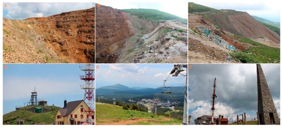 (A,B) Surface excavation at an ore field “Suvo Rudište”; (C) tailings at an ore field; (D) Pančić Peak; (E) view from the ore field to the tourist center “Kopaonik”; (F) pyramid (1976 m).