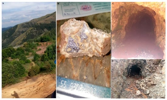 (A) Raičeva gora; (B) antimony ore sample from the site; (C,D) mine shafts.