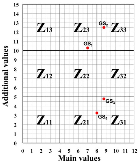For the purpose of graphical representation of the evaluation results, a GAM matrix has been created, which is divided into nine fields (zones) using a grid, denoted Z (i, j) (i, j = 1,2,3). The matrix consists of the X (MV) and Y (AV) axes, which represent the geosite values. The main lines of the network have values of four units on the X and five units on the Y axis. Depending on the grade, the estimated geosite occupies a certain field, which clearly determines its value and, depending on the main values, the existence of so-called “tourist value”.