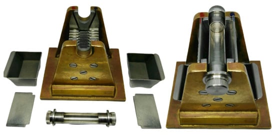 The initial laboratory procedures depend on sample type. In the case of hard rocks, the first step is to mechanically disaggregate the sample minimizing pulverization. Rocks are split with a manual or hydraulic press in small centimetric chips (Figure 2). Between 20 and 40 g are generally sufficient to obtain the desired amount of heavy minerals, and the rest of the chips can be archived. The part of the sample collected in a tray is weighed and placed in an agate mortar with 10–20 mL of deionized water to prevent loss of material and the production of powder, which is harmful to breathe. A pressure is exerted repetitively with the agate pestle, avoiding rotational movements that may lead to grain grinding. Gentle percussions have been experimentally demonstrated to cause negligible breakage of heavy minerals (Henningsen, 1967 [19] and Mange and Maurer, 1992 [20] (p. 11)).