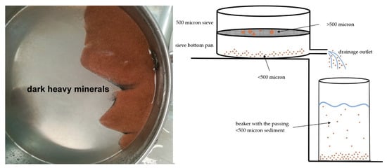 Figure 4. Dense minerals concentrate in the sieve bottom pan during wet sieving with a sketch of the apparatus described in Section 5.1.