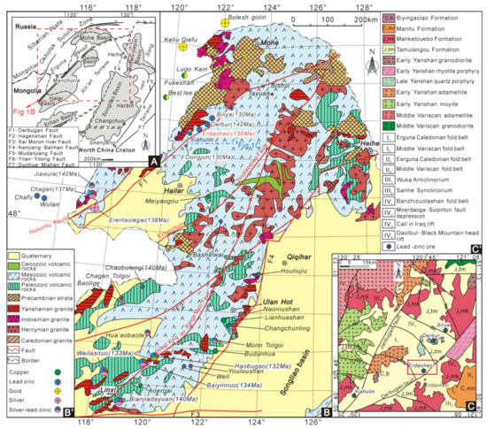 - Nie, F.J.; Li, Q.F.; Liu, C.H.; Ding, C.W. Geology and origin of Ag–Pb–Zn deposits occurring in the Ulaan–Jiawula metallogenic province, northeast Asia. J. Asian Earth Sci. 2015, 97, 424–441. [Google Scholar] [CrossRef]