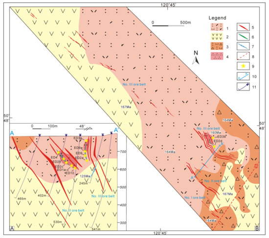 The Erdaohezi deposit, located southwest of Genhe city, is a large epithermal Pb–Zn polymetallic deposit. Geological surveying of the mining area has revealed that the stratigraphy is dominated by Middle Jurassic felsic volcanics (rhyolitic lithic–crystal tuffs) of the Manketou Obo Formation (164 Ma) and basic–intermediate volcanic rocks (basaltic andesite) of the Tamulangou Formation (167 Ma). The ore bodies occur in the Tamulangou Formation volcanics, Manketou Obo Formation volcanics and quartz porphyry. Northwest and north-northwest-trending faults diverge to the northwest and converge to the southeast, sharing a genetic relationship with the volcanic edifice [53], and the spatial distribution of the Pb–Zn polymetallic bodies in the mining area is controlled by these faults. The hypabyssal intrusions in the Erdaohezi deposit are composed of Late Jurassic quartz porphyry and of Early Cretaceous andesite porphyry and monzonite porphyry. The monzonite porphyry formed after mineralization and thus cuts through the ore body, indicating the existence of multistage magmatic activity within the ore district. The mineralization of the Erdaohezi Pb–Zn polymetallic deposit is related to the quartz porphyry and andesite porphyry (Figure 2A,B; Figure 3A).